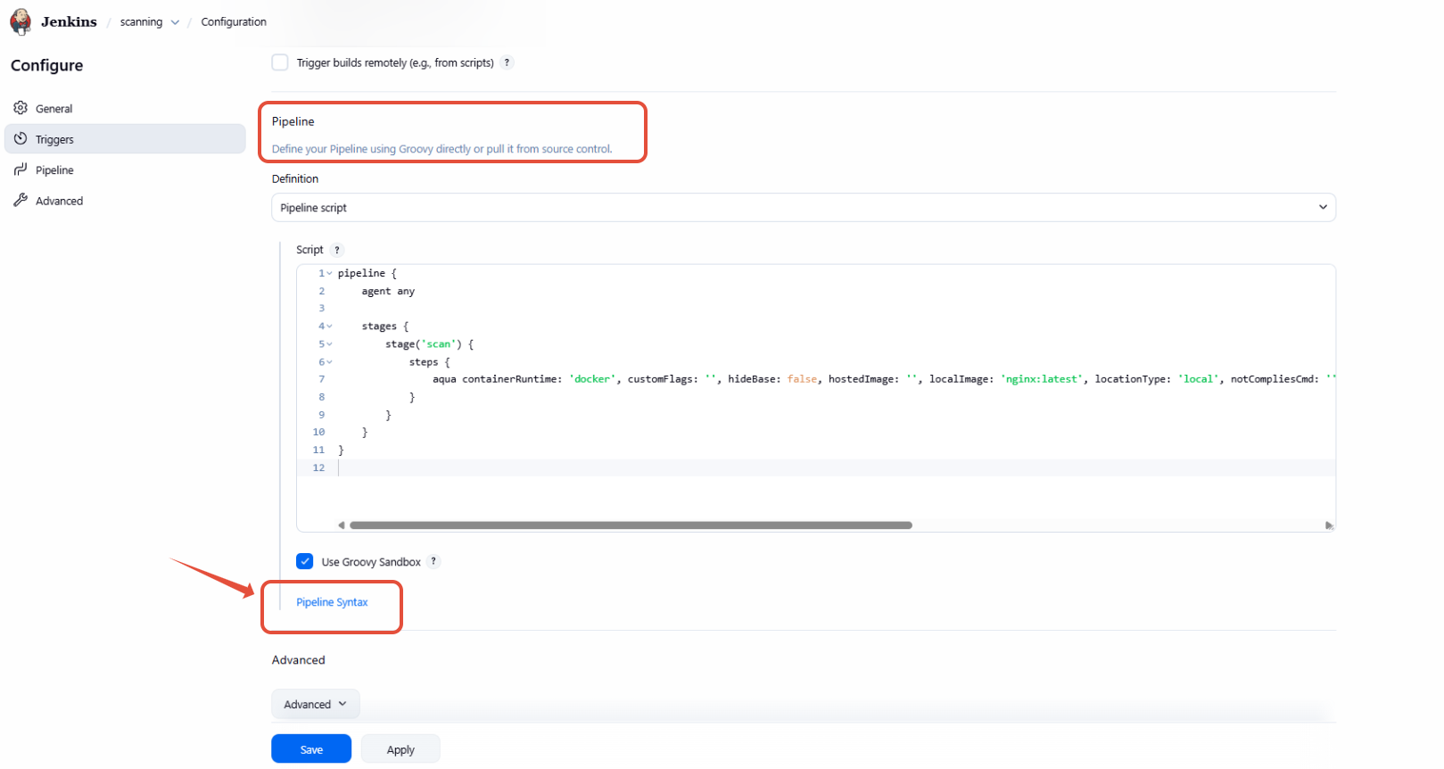 Here we use pipeline script to integrate scan stage to the pipeline