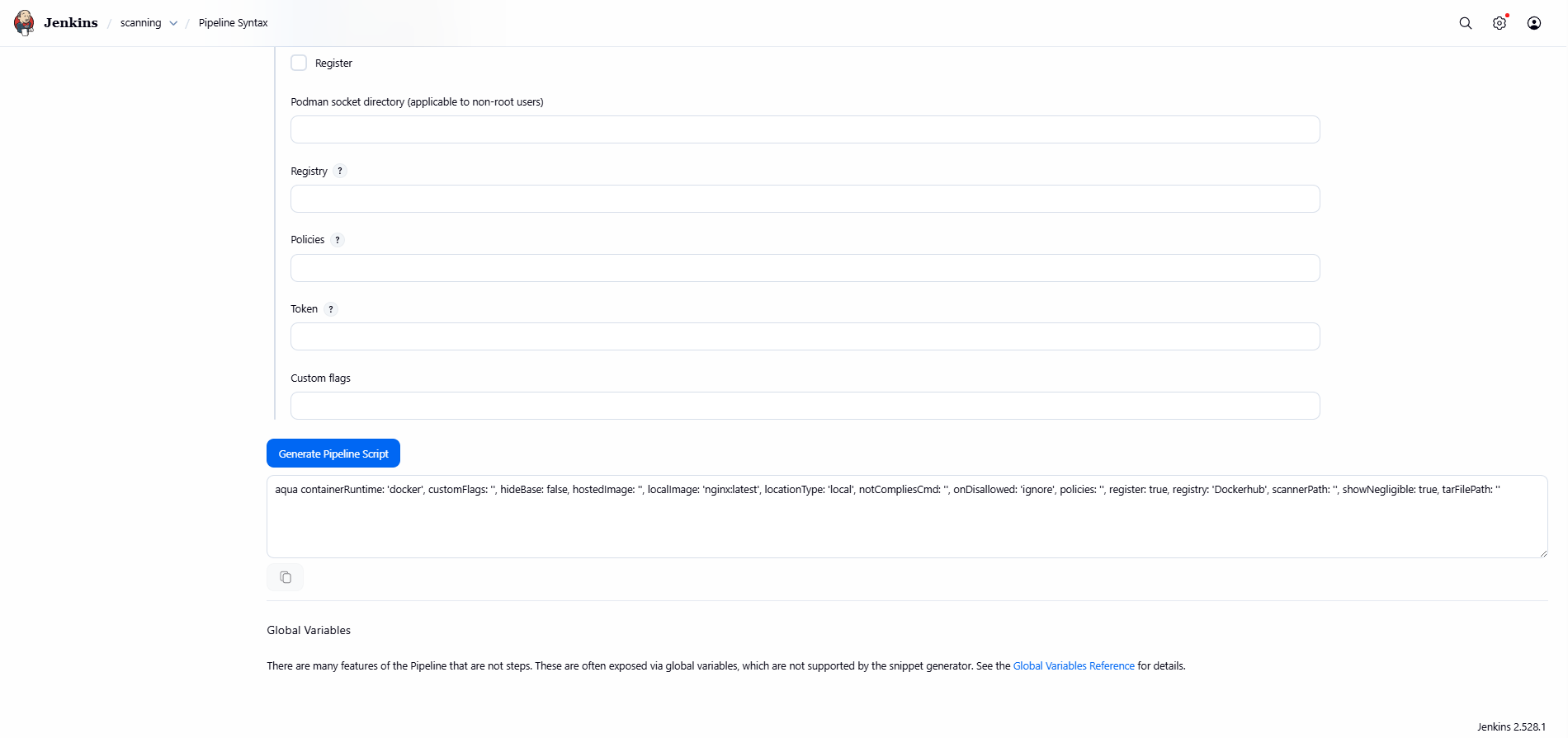 | Register | Select the Register checkbox to register the image with the Aqua Server after it is scanned. You can select this option if you have selected local in the Scan type field |