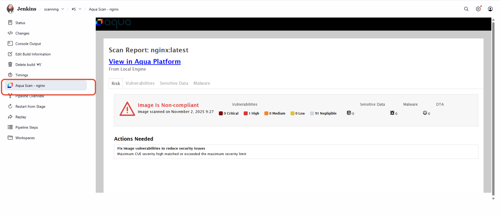 aqua containerRuntime: 'docker', customFlags: '', hideBase: false, hostedImage: '', localImage: 'nginx', locationType: 'local', notCompliesCmd: '', onDisallowed: 'fail', policies: '', register: false, registry: '', scannerPath: '', showNegligible: true, tarFilePath: ''