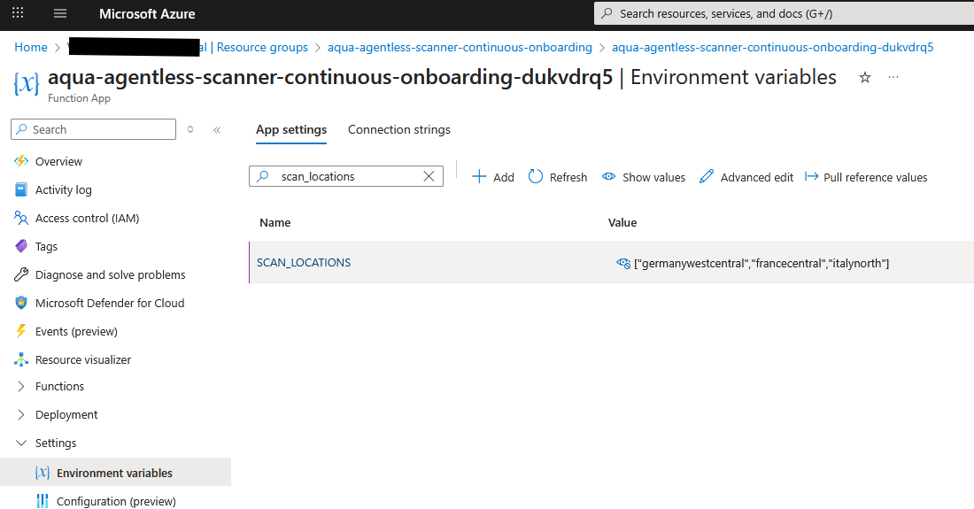 directly amend the Environment variables in the aqua-agentless-scanner-continuous-onboarding - Function App accordingly: