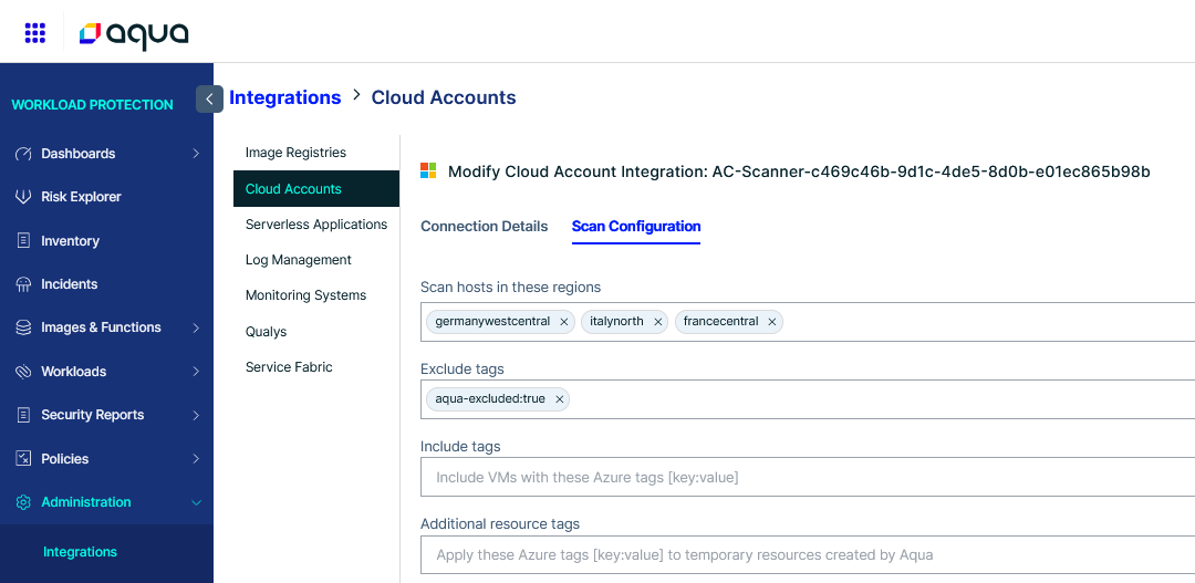 SCAN_LOCATIONS ["germanywestcentral","francecentral","italynorth"] NETWORK_SECURITY_GROUPS_NAME ["aqua-agentless-scanner-germanywestcentral","aqua-agentless-scanner-francecentral","aqua-agentless-scanner-italynorth"] VIRTUAL_NETWORK_NAME ["aqua-agentless-scanner-germanywestcentral","aqua-agentless-scanner-francecentral","aqua-agentless-scanner-italynorth"]
